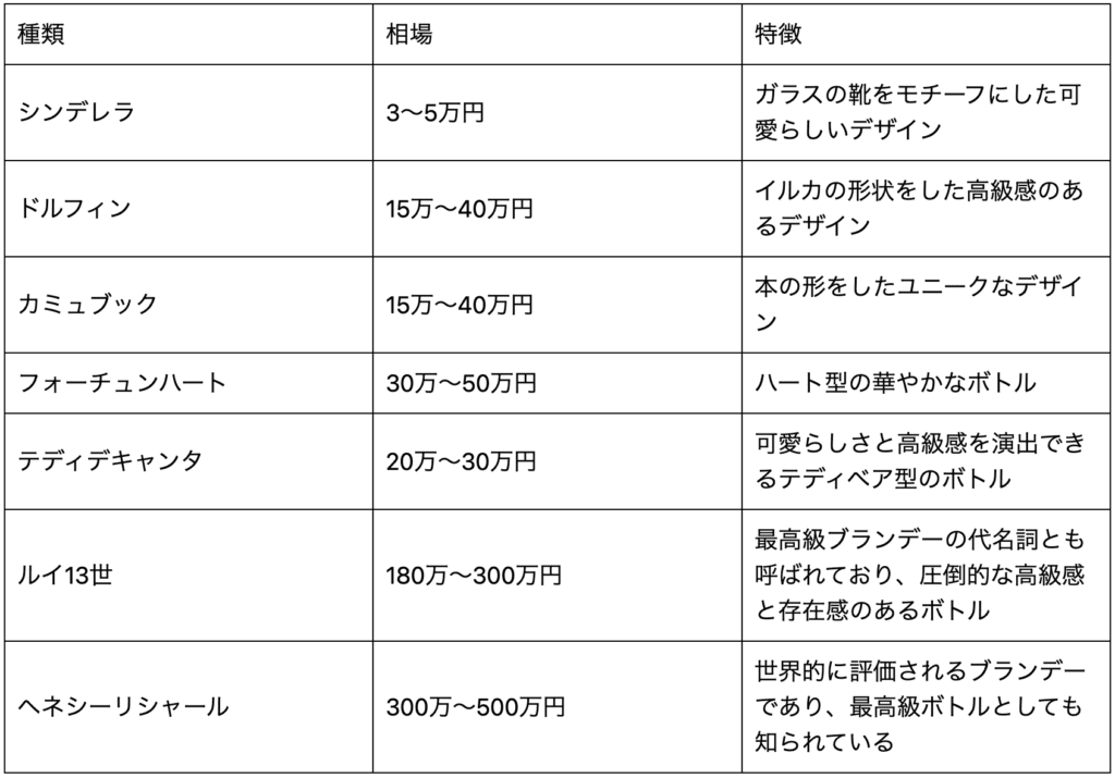 ホストクラブやキャバクラ、ナイトクラブなどで人気を集める代表的な飾りボトルは、次のとおりです。相場は、ホストクラブやキャバクラなどでの販売価格を表記しています。