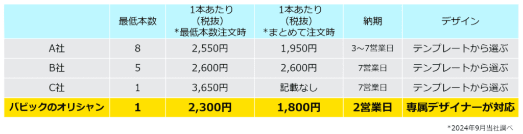 ここでは「デザイン費込みかどうか」「送料やオプション料金が発生するか」などを明確にしておくことが大切です。納期に余裕がない場合は、最短対応が可能かどうかも早めに確認しましょう。